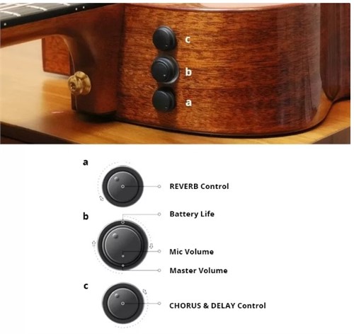 Công nghệ đột phá của AcousticPlus biển chính mặt sau thùng đàn thành loa và cho phép người chơi thêm hiệu ứng âm thanh (Delay,