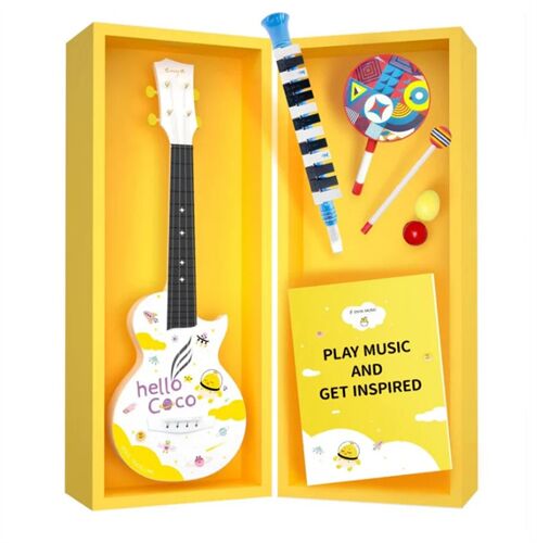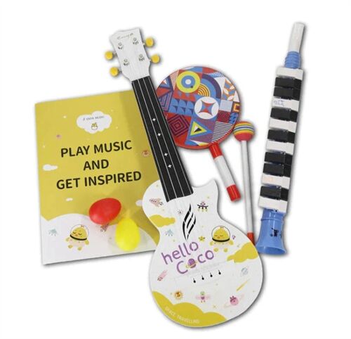 Mini Coco bao gồm một cây đàn ukulele sprano thú vị, một cây đàn melodica 13 phím, hai shakers quyến rũ và một chiếc trống cầm tay Lollipop.
