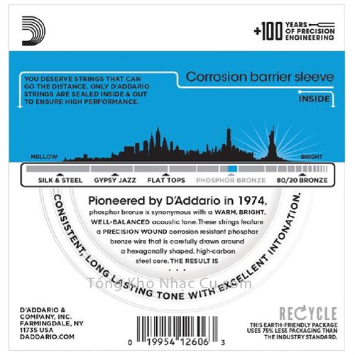 Dây Phosphor-Bronze của D'Addario lần đầu tiên được giới thiệu vào năm 1974, từ đó đến nay nó luôn được biết đến với những ưu điểm như âm thanh ấm, sáng và đều tiếng, bên cạnh đó là khả năng chống ăn mòn cao cùng độ bền tốt, bạn có thể không phải thay dây trong một khoảng thời gian đủ dài.