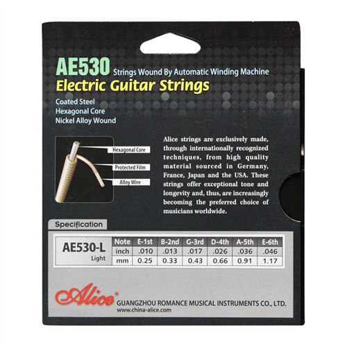 Dây đàn guitar điện Alice AE530 có lõi làm bằng thép, mạ vàng đồng bên ngoài, thông qua công nghệ cuộn tự động và các kỹ thuật chống gỉ đặc biệt. Các dây được quấn đối xứng, cho giai điệu chính xác, âm sắc ngọt ngào và tuổi thọ cao. Tất cả các chuỗi dây được bọc kín trong gói nhựa cá nhân để bảo quản chất lượng tốt nhất tới tay người sử dụng.