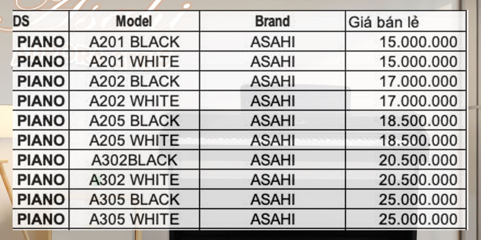 Bảng giá niêm yết Đàn Piano Asahi Chính hãng: