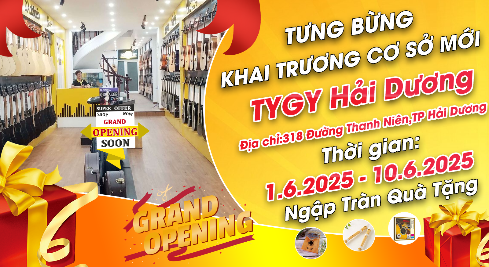 🎶 Đây không chỉ là một buổi khai trương, mà là ngày hội âm nhạc dành cho mọi lứa tuổi, mọi đam mê! Dù bạn là người mới bắt đầu hay nghệ sĩ chuyên nghiệp, TYGY Music Hải Dương sẽ là điểm đến lý tưởng để bắt đầu hành trình âm nhạc của bạn. 📍 Địa chỉ: 318 đường Thanh Niên, TP. Hải Dương 🗓 Thời gian: 01/06 - 10/06/2025 ⏰ Từ 8h00 - 21h00 mỗi ngày 🌟 TYGY Music trân trọng kính mời quý khách hàng, các bạn yêu nhạc và toàn thể cộng đồng đến tham dự chương trình khai trương cùng chúng tôi. Hãy đến trải nghiệm không gian âm nhạc đầy cảm hứng, săn ưu đãi khủng và mang về những món quà tuyệt vời! Sự hiện diện của bạn là niềm vinh dự lớn đối với chúng tôi!
